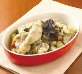 3續加入高湯與作法1的1/2紫蘇絲燉煮至雞腿熟透,再放入鮮奶油和剩餘紫蘇葉燉煮,並以鹽、胡椒調味即可。