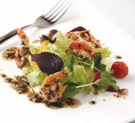 3綜合生菜拌和紫蘇油醋汁,放上煎好的紫蘇蝦即可。