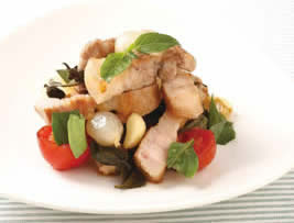 3熱鍋放入豬五花肉條煎香至表面金黃,放置作法2的材料上,再撒上羅勒並淋上橄欖油,續放入烤箱烤8分鐘後取出。