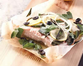 2打開烤焙紙,放上作法1的鮭魚與黃檸檬片、羅勒、洋蔥絲、黑橄欖片、酸豆,再撒上少許鹽與綜合香料(材料外)將烤焙紙包起後,放入180℃烤箱烤約15分鐘即可。