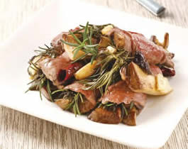 2取牛肉片,取適量作法1煎好的菇類與迷迭香捲入成為迷迭香牛肉卷,至材料用盡。