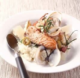 迷迭香30公克、白米50公克、花枝30公克、鮮蝦2尾、蛤蜊3顆、鮭魚30公克、淡菜2顆、洋蔥碎30公克、牛奶50cc、高湯120cc、帕馬森起司15公克