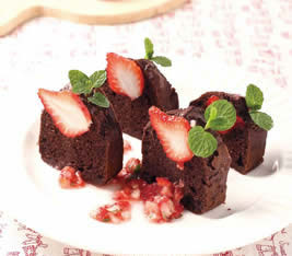 4取出作法3的巧克力鬆糕切片,放上作法1的草莓薄荷醬即可。