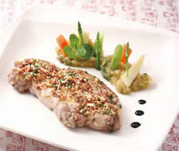3鍋內加入少許沙拉油,放入作法1的醃漬過的豬里肌肉,將兩面煎至金黃,再撒上薄荷碎、綜合堅果碎,蓋上鍋蓋轉小火燜燒6分鐘開蓋即可。