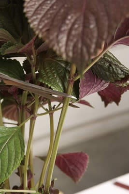 紫蘇葉片較大,因此剪半葉以減少吸收負擔。