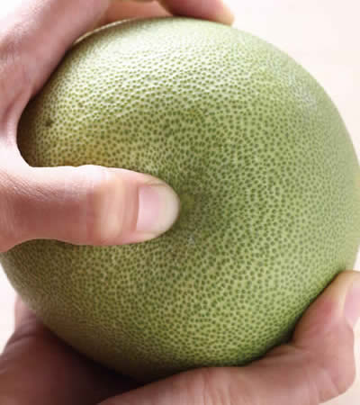 挑選柚子不需要像挑選鳳梨或西瓜一樣,用指頭去彈、傾耳聽迴音。一來先選擇外型完整、色澤亮麗、重量沈甸甸的柚子;再往柚子尾端壓看看。如壓的下去,代表已成熟。如還硬硬的,那就至少還要放一個禮拜。