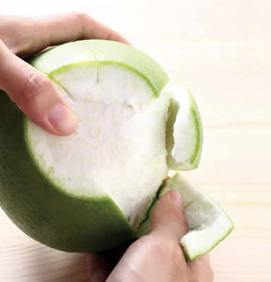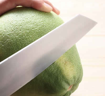 1. 若是柚子外型較長,再切去頭部的步驟時,就要切較裡面;若是外型較圓,則可以切外面一些,才不會切到果肉。