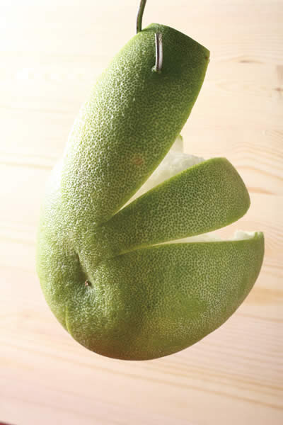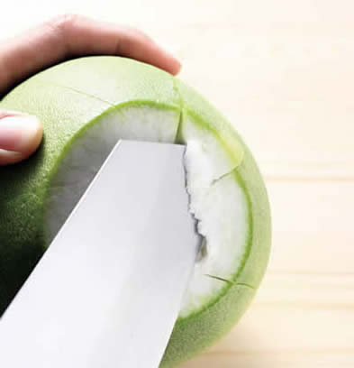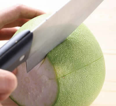 2. 去掉柚子頭部後於柚子皮上劃刀,注意不要切到果肉。