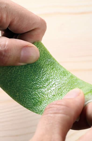 4. 先將柚子皮內部的白色纖維部份去掉、以免有苦味。切細絲、並用熱水稍微