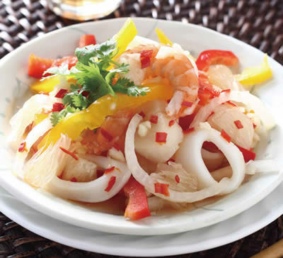 中卷 70公克,蝦仁 60公克,新鮮干貝 60公克,洋蔥絲 50公克,黃椒絲 40公克,紅甜椒絲 40公克,柚子果肉 30公克