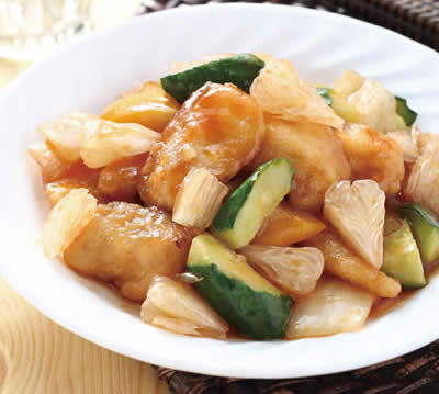 鯛魚 150公克,洋蔥 60公克,小黃瓜 1條,黃甜椒 50公克,柚子果肉 50公克