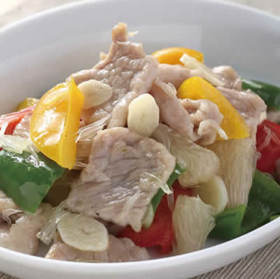 豬肉 80公克,柚子果肉 60公克,紅甜椒 60公克,黃甜椒 60公克,青椒絲 60公克,蒜片 10公克,水 50㏄