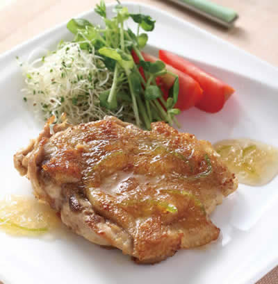 去骨雞腿 1支,苜蓿芽 適量,豌豆苗 適量,蕃茄塊 適量,柚子醬 適量