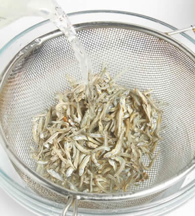 1. 丁香魚乾放入濾網中,用冷水稍微沖洗後瀝乾水分,備用。