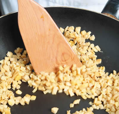 3. 熱鍋,放入作法1蘿蔔乾碎,以小火乾炒約3分鐘,待水分略乾且散發出香味,盛出備用。