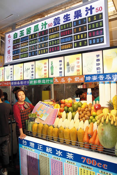 「台灣正統冰茶」是間現打鮮果汁店,在士林夜市開 業三十多年,攤位上放置滿滿的新鮮水果,等候時許多觀光客不禁拿起相機拍起眼前的水果,因為真的太美了啦!店內的果汁品項多達6、70種,除了精心調配比 例的新鮮果汁和調味茶系列外,也持續研發出冰沙、奶茶、雪泡以及茶系列飲品,深受各年齡層顧客歡迎,老闆透露所有水果都是當天一大清早從濱江市場批發購買 而來,保證新鮮可口,店內的果汁單純用水果的甜味代替糖,招牌的綜合水果汁,一杯才40元,滋味濃郁而且很順口,另一項人氣飲料蜂蜜苦瓜汁,是用新鮮整顆 苦瓜打成的,雪白色的果汁喝起來不但不苦,還有著淡淡蜂蜜香。