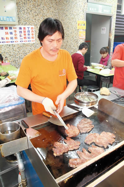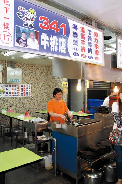 「341牛排店」營業至今有三十餘年,第一代賣得 是牛肉麵,對牛隻構造知之甚詳,第二代接手後轉型於夜市賣牛排,這裡牛排選用紐西蘭進口牛肉,每塊均有四兩半至五兩重,將牛肉先醃過入味,最後才煎,下面 鋪著鐵板麵與蔬菜,打個蛋,然後蓋上全熟的牛排,淋上店家獨門特調的蘑菇或黑胡椒醬汁,鐵板在醬汁倒入的那一剎那,不時發出滋滋滋的聲音,肉的軟嫩和 sauce的甜味恰到好處,激盪起更多的食慾,另有豬、雞口味,以及飲料無限供應,一份只需150元令客人趨之若鶩,經常從下午