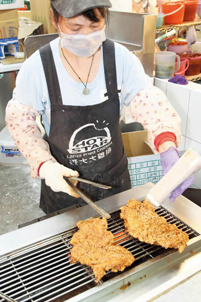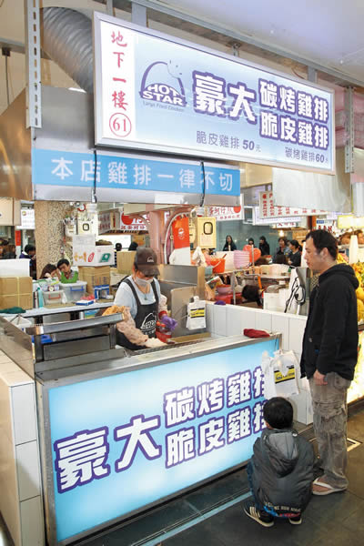 發跡於士林夜市陽明戲院前的「豪大大雞排」以超大 雞排闖出名號,曾經創造出一天賣出三千片的銷售佳績,是該夜市裡指標性的小吃之一,雖然在士林已有兩家分店,由於太受歡迎,仍然在新夜市的美食街擺設攤 位,有別於分店販售沾上乾粉油炸的台式雞排,此攤以販售兩種特殊作法的雞排為特色,利用獨家的中藥醃製配方將雞胸肉醃漬過後,一是沾上濕粉油炸,二是沾上 乾粉碳烤,雞排體積仍保持一般雞排的1.5倍,將剛從油鍋夾起的雞排比一比,可發現比成人臉還要大!外皮香酥肉汁鮮美,香味撲鼻,令人忍不住食指大動,攤 子前總是排滿長長人龍,愛吃雞排的遊客得有心理準備耐心等候。