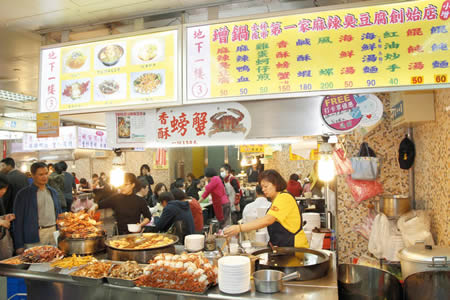 「增鍋臭豆腐」是士林夜市老店之一,號稱是第一家 將麻辣臭豆腐引進該夜市的創始店,這裡的麻辣臭豆腐特色在於口感軟嫩中又帶些紮實,辣味十足卻又不至於過頭,臭香臭香的滋味十分迷人,而且主力產品相當 多,除了最招牌的麻辣臭豆腐,還有炸螃蟹、鹹酥蝦、藥燉排骨、蚵仔煎、海鮮湯、紅油抄手等,其中香酥美味的炸螃蟹也很受到青睞,每份都用了三隻去殼螃蟹, 因蟹肉新鮮,賣多少炸多少絕不隔夜,同時,油炸的火候控制得宜,裹上地瓜粉後,約炸五分鐘起鍋,加入椒鹽調味,便香氣四溢、滋味甘美,鹹酥蝦也是一絕,蝦 殼炸得酥香,殼脆彈牙、蝦味鮮美,讓人忍不住一隻接著一隻吃下去。