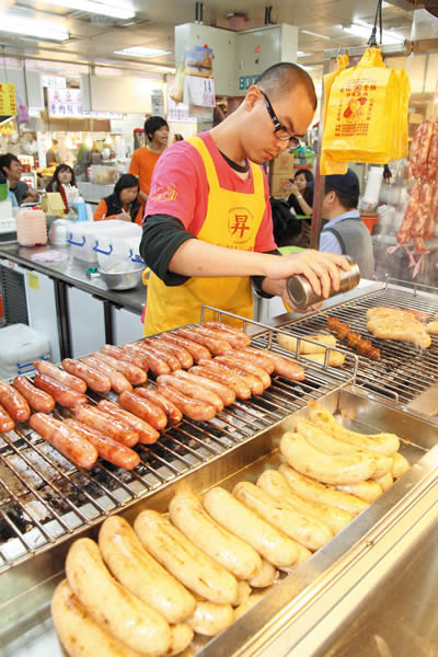 飽滿潤紅的香腸排成一列,看似紅艷可口,鼓鼓的糯 米腸有著紮實內餡,香腸跟糯米腸都是現煎,烤的過程中還流出滾滾肉汁,令人瞬間食指大動,將米腸切半,鋪上菜脯、香菜、小黃瓜絲,夾上現煎的紅色香腸,包 裹在紙袋裡捲成橢圓狀,就是遠近馳名的士林小吃「大腸包小腸」,也是另類的台式熱狗堡,賣了50年的店家表示,香腸是每天以新鮮豬肉製成,肥瘦比例均勻, 現烤現煎,咬起來充滿鮮美肉汁且不乾澀,並選擇品質較優的紅木炭燒烤,不沾黏炭灰,且能引出香腸甜味,每當爐前燒烤時,總能吸引不少聞香而來的顧客,口味 分有高粱、黑胡椒、芥末、蒜味等種類,如果想品嚐香腸的原味,單支香腸、糯米腸也是不錯的選擇。