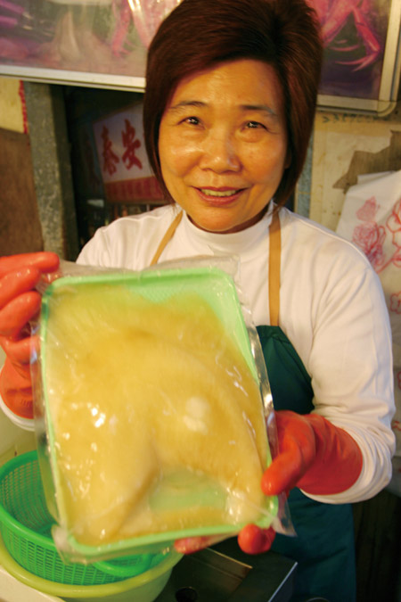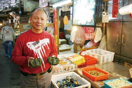 金銀海鮮號,台南嘉義魚貨,客源多為30多年上海人老主顧,烏魚游至台灣時正是最熟成的時候也最好吃,挑選好的烏魚子,老闆建議顏色深一點比較成熟,還有有血管分布才是真貨。紅蟳交配過,肚子裡是紅色的蛋,腹部飽滿,而處女蟹的購買訣竅是蟹膏新鮮、屁股要厚要翹。