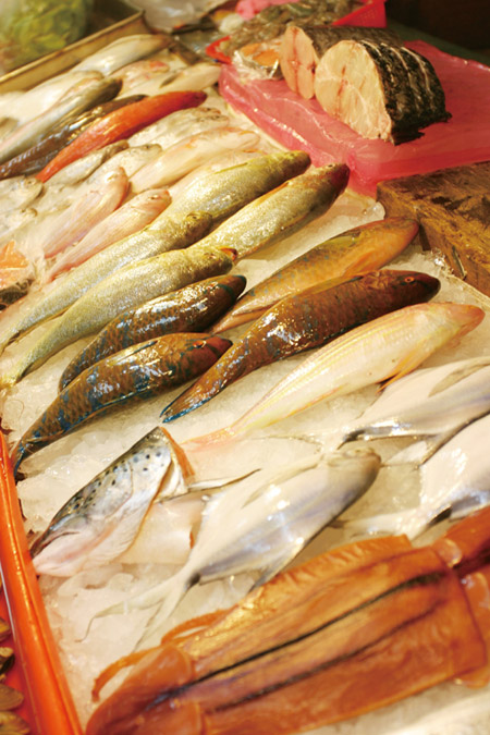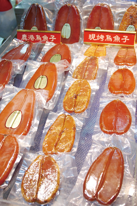 基隆鮮魚,來自基隆東北角本土魚貨;鹿港不鹹不腥的烏魚子;唯一一家販售現烤烏魚子;來自南方澳的深海KISS魚;以孛薺、蝦、花枝、魚漿自製蝦捲(原味&咖哩),提供真空包裝貼心服務。