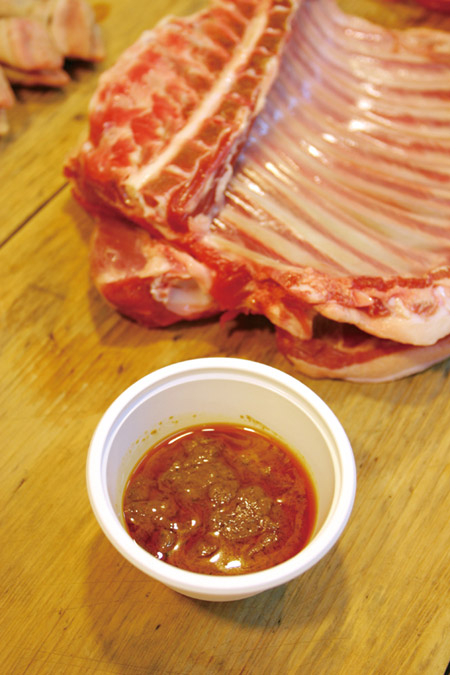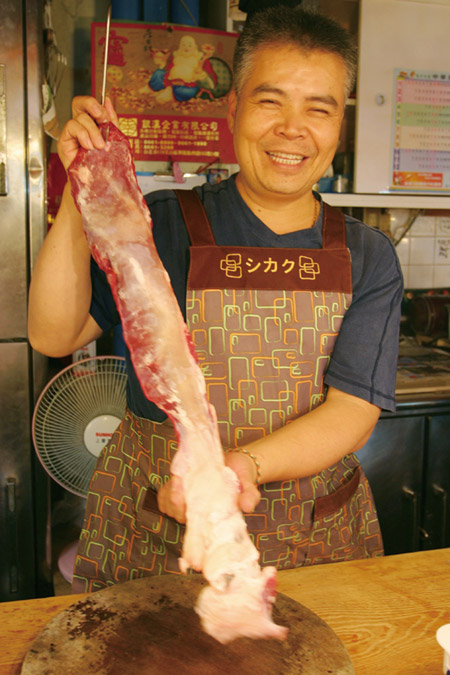 本地黑毛豬,在東門市場已有55年的歷史了,來源為桃園吃餿水的鄉下豬,肉質甜美,至於為什麼不選飼料豬呢?因為飼料豬會有味道。選購豬肉小技巧:油脂油花多、豬油有亮度,肉色轉黑就不新鮮。