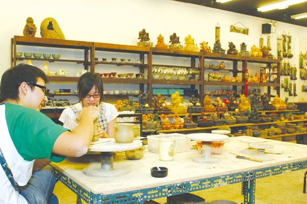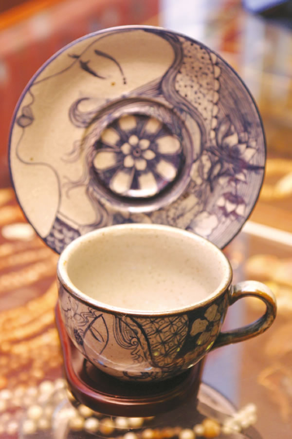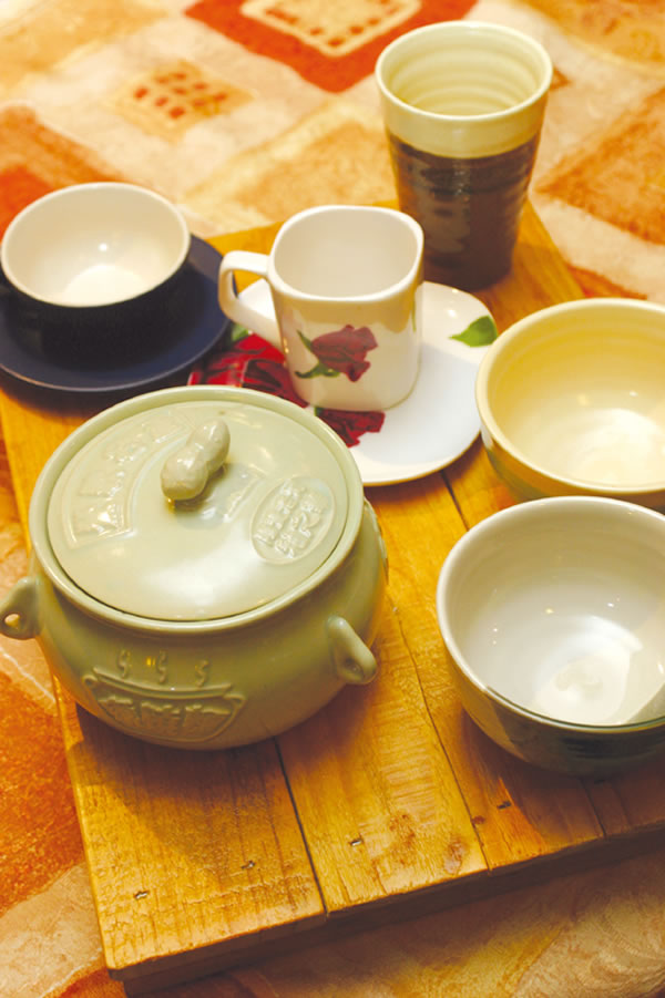 原來,這兒除了是展覽室外,還展老闆夫婦倆人合力創作的作品,陳列出的商品裡,除了象徵鶯歌特產杯盤陶瓷品外,還有服飾以及藝術品,更有女用的飾品,大多數都是夫妻倆人的作品,可說是在外面都看不到的商品。