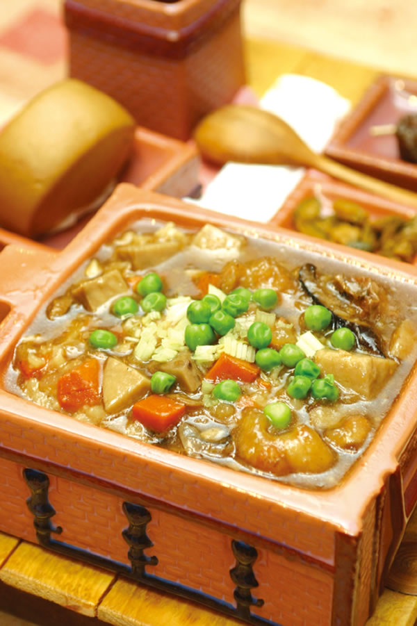 既然它是以芋頭與肉下去熬製而成的話,又為何取名 為泥漿粥呢?主要是因為「泥漿」兩字若用台語發音,會發現它與「粥」字諧音,因此才會將這道菜取名為「泥漿粥」。在取名上有著館長的巧思,在料理的盛盤上 更見到他那對鶯歌老街的懷舊執著與心意,因此盛泥漿粥所使用的碗是迷你的窯爐器具,這個器具是館長特別訂做燒製的,之所以使用這個器具最主要是因為,過去 在鶯歌老街這個地方幾乎每戶人家都會製陶,但是要量產賺錢就一定要有窯爐才行,所以又名為「聚寶盆」。只要點這道料理,就能帶走這組又名為「聚寶盆」的窯 爐。