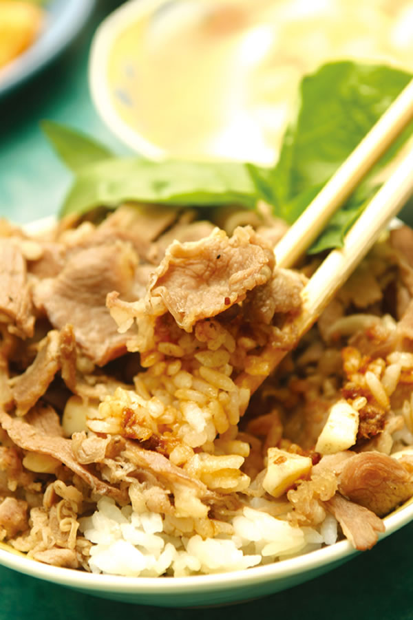 為了要去掉羊肉中那特有的膻腥味,老闆特別將羊肉浸泡在獨家的醬料裡一天一夜,再取出用熱水汆燙,最後再放到白飯上,讓客人享用。在吃羊肉飯時,會發現到羊肉與白飯的中間裡,會放上具香氣的沙茶醬以及蒜末,嚐起來更有著辛香的味道。